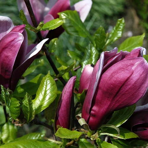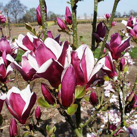Листья светло-зеленые с волнистым краем. Цветочные почки имеют темно-красновато-пурпурный цвет и сохраняют этот цвет на внешней стороне лепестков, но внутренняя часть лепестков – более светло-розово-фиолетовая. Цветки ароматные, имеют чашеобразную форму и могут вырастать до 20 см в диаметре. Цветет в начале и середине сезона. Магнолии нужные места защищены от ветра и сквозняка. Лучшим местом для посадки будет солнечный, в южных районах – слегка притененный участок с легкой плодородной почвой Морозостойкость до 25℃