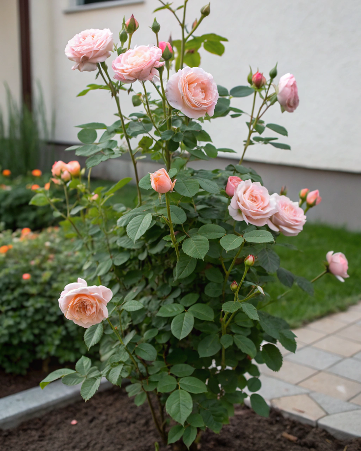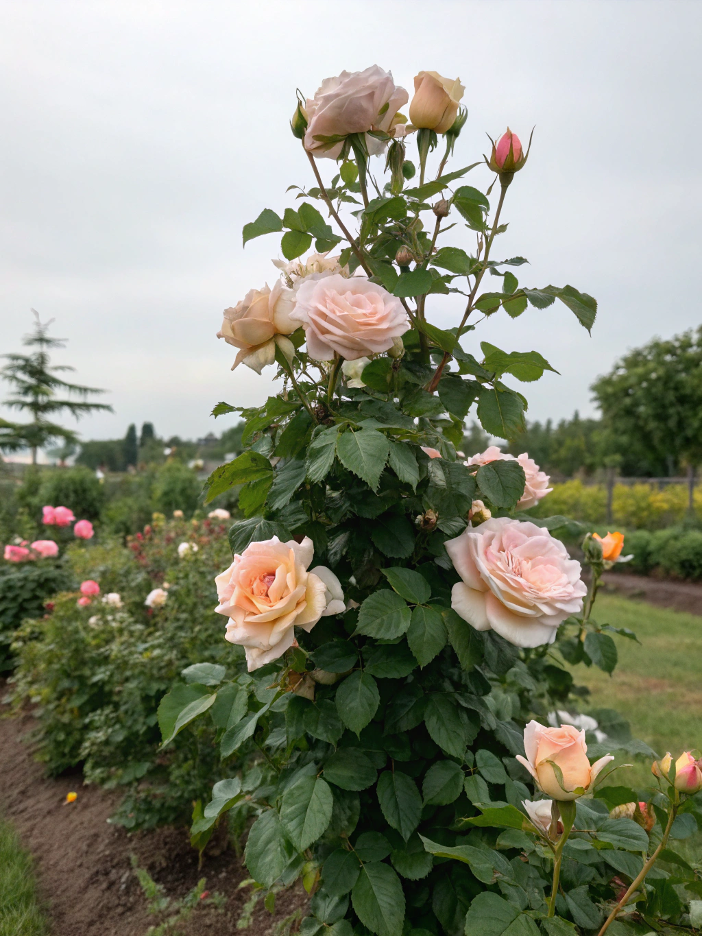 Шикарная роза цвета шампанского, с жемчужным блеском лепестков. Цветение волнами, куст мощный, на штамбе выглядит аристократично.
