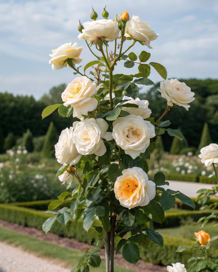 Бело-кремовая роза с золотистым центром. Элегантность во французском стиле. Один из самых дорогих штамбов на рынке.